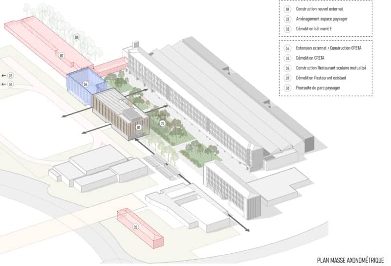 Le projet s’inscrit dans le programme de réhabilitation thermique des lycées de la Région Bretagne issus de la période de reconstruction des Trente glorieuses. La construction du nouvel externat remplace celui de 1959, démoli et désamianté.