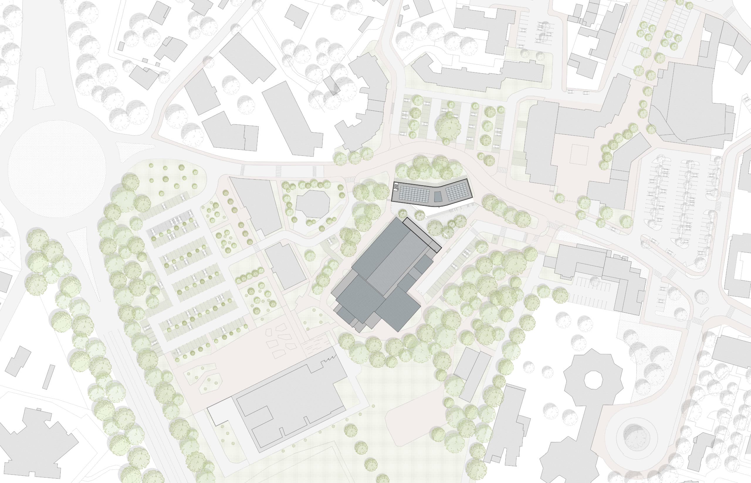 La nouvelle Maison des associations et des sports répond à un besoin d’espaces collectifs partagés modernisés et adaptés aux nombreuses associations vernoises. Le bâtiment s’implante en recul du complexe sportif actuel, partiellement démoli et dont l’entrée sera remodelée. Notre projet de forme courbe s’intègre au paysage de manière sensible et se décale, guidé par les vides qu’il génère. Cette nouvelle configuration apporte une respiration dans le site avec la création d’une place identifiable et traversante, qui favorise les mobilités douces entre les sites boisés. Ces aménagements urbains et paysagers s’intègrent dans l’enchaînement des « places de Vern » déjà présentes dans l’espace communal, liant les polarités du centre-bourg et les équipements publics.