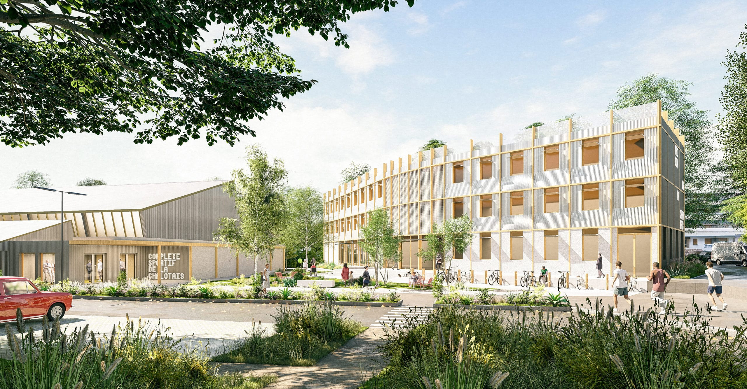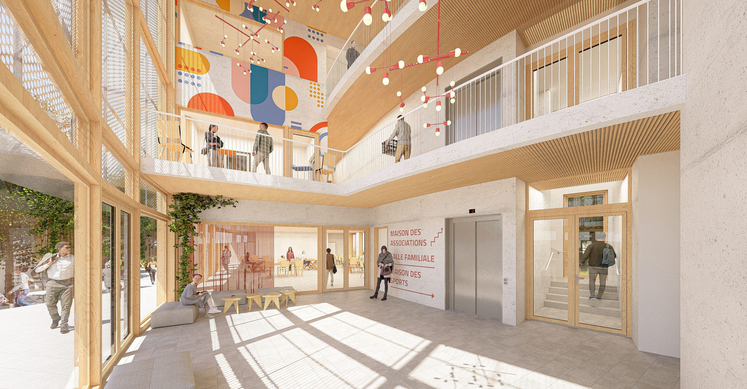 Reconstruction d’un équipement maisons des associations et des sports et aménagements des espaces extérieurs en cœur de ville, au sein d’un espace boisé : hall central, atrium, espaces de vie et de travail individuel et collectif, salles associatives, salle des familles, salle de réunion, espaces techniques…