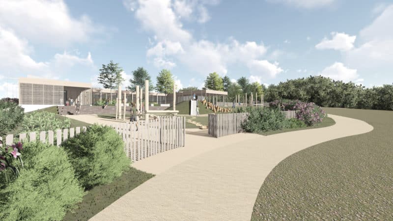 Le nouveau restaurant scolaire s’inscrit dans une approche paysagère et urbaine globale, dans un schéma de développement et de conservation des espaces naturels. La construction de l’équipement prend en compte la topographie du site, la lisière bocagère, les cheminements doux à maintenir et poursuivre, les vues sur le paysage naturel attenant. Il est conçu comme un parcours à travers la campagne et le bocage, comme une cabane nichée dans la nature, un observatoire.